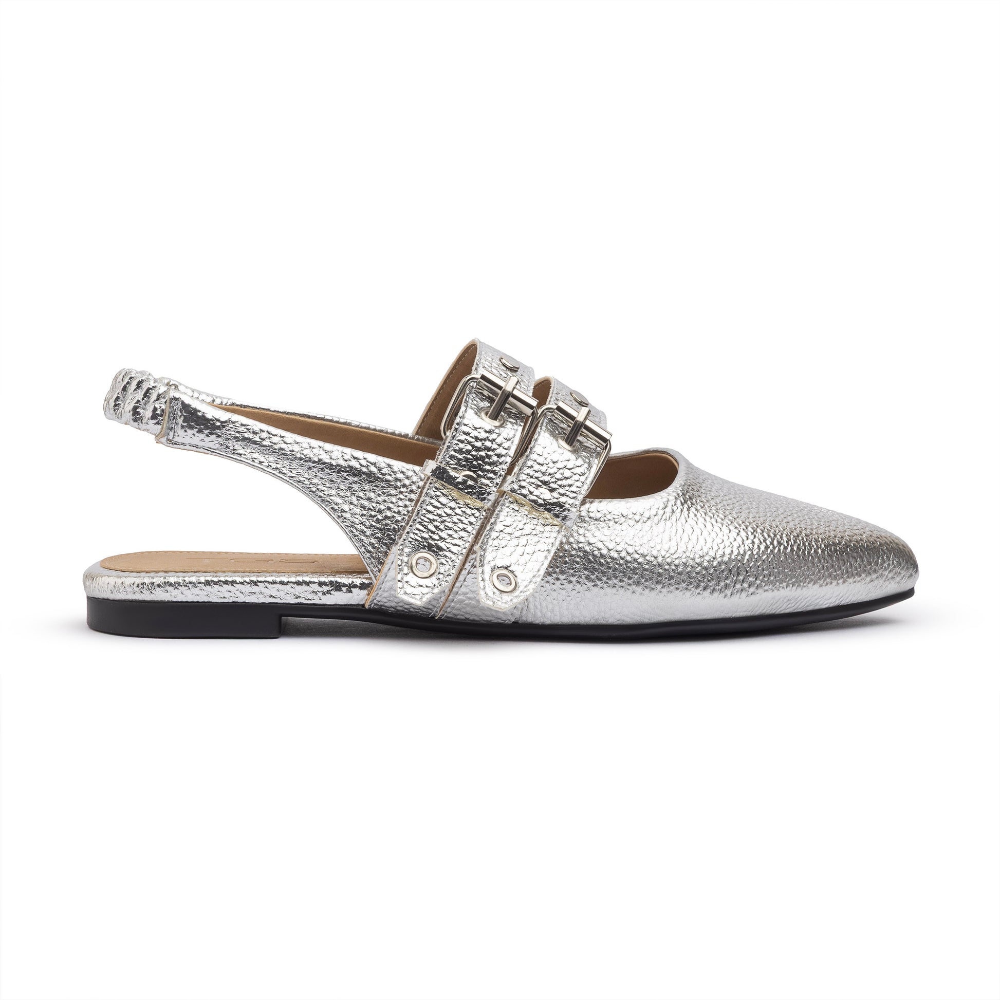 Double Belt Flat Slingbacks Pebbled Metallic In Silver